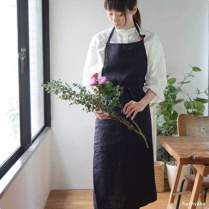 ウォッシュドリネン100%のエプロンです 。リネンは汚れが付きにくく、また落ちやすいです。お洗濯をしてもすぐ乾くので、清潔に使いたいキッチンにはぴったりの素材です。