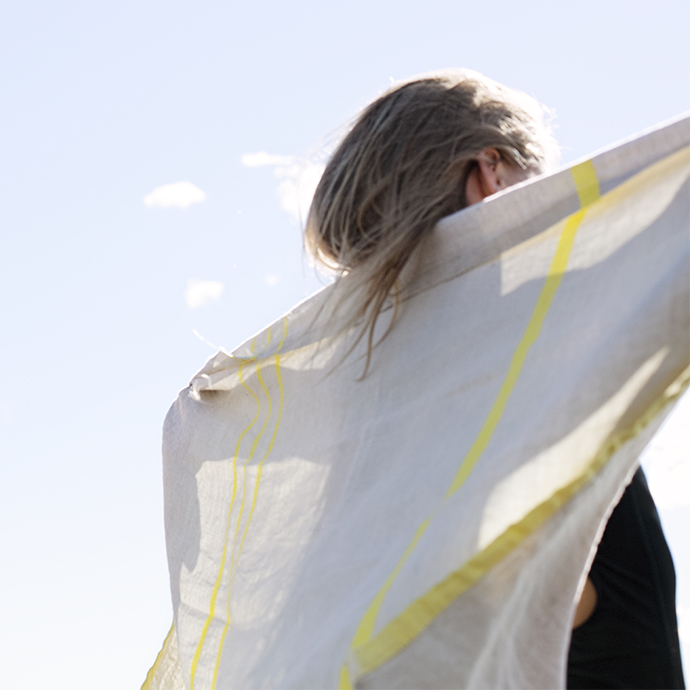 ラプアン カンクリのUSVAマルチユースタオル(95×180cm)は、大人が羽織るとひざ下まで包まれる安心の大きさ。通気性が良く熱がこもりにくいリネン製で、体が冷えた時や、日よけをするときなどに便利です。羽織った時に生活感が出ず、おしゃれに使える快適な一枚です。
