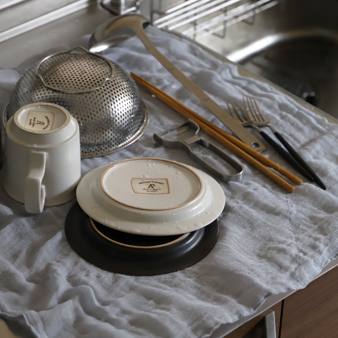 また発売当初から変わらぬ製法で奈良で織り上げ、一枚ずつミシン掛けで縫製。日本のものづくりで生まれた丈夫なふきんは、食器・台拭きはもちろん、出汁とり、鍋つかみ、弁当包み、そして最後は雑巾へと。くたくたになるまで長くお使いいただけます。