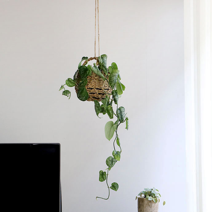 観葉植物のカバーにも使ってみました。持ち手に手持ちの紐を取り付ければ、ハンギンググリーンも楽しめます。置いても吊るしても良し。グリーンも見た目に涼し気で、これからの季節にぴったりです。