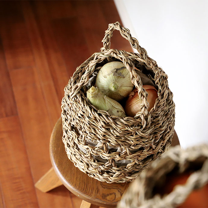 例えば、根菜やフルーツの常温保存用収納に。野菜くずが落ちないよう、やわらかい紙をくしゃくしゃっとして、敷いて使います。かごの側面が透かし編みだから、通気性は抜群です。