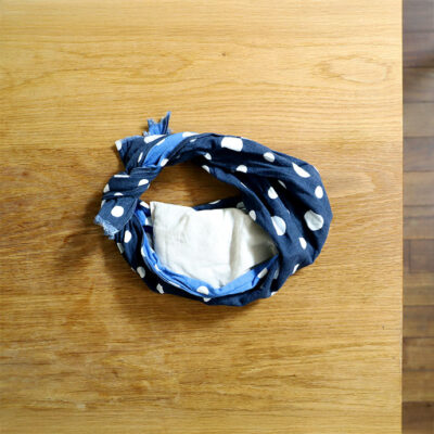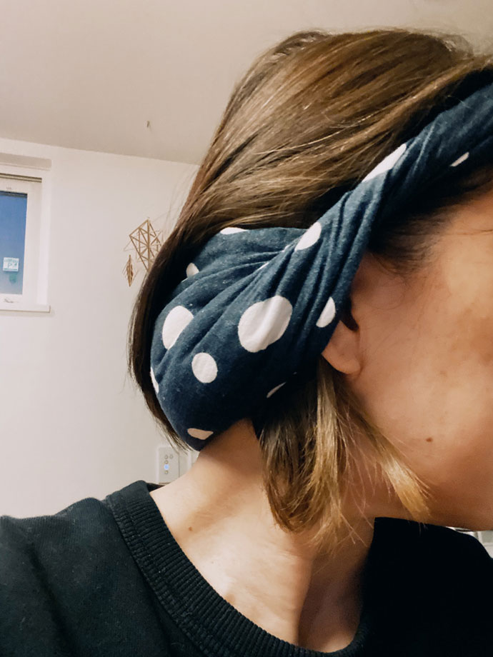 アイピローは、普通に使うと上向きに寝転んでいる時しか使えないので、思いつきで、レンジで温めたピローを手ぬぐいで包んで、ターバンみたいに頭に巻いてみた。