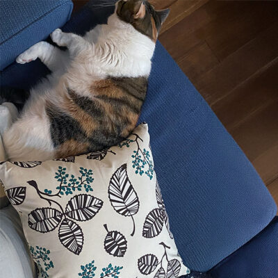 自宅ではクッションカバーを愛用中。こちらは、彼女の妹の名前である「クララ」という柄。家族を大切にする人柄が現れていて、そのあたたかなコンセプトに惹かれました。
