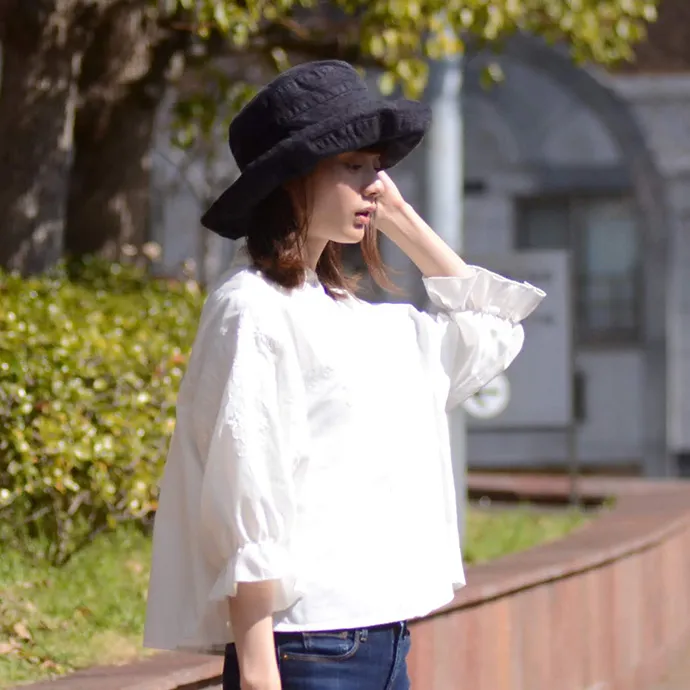 首の後ろまで隠すことができる大きめのつばが、強い日差しからお肌を守ってくれます。コンパクトに折りたためてサイズ調整可。ふんわり被ることができるので、髪の毛も崩れにくいようです。