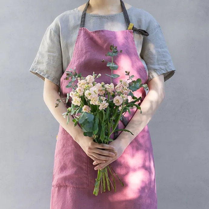 ウォッシュドリネン100%のエプロンだから、洗いっぱなしでOK。シンプルなデザインだから、料理、お掃除、庭仕事など、どんなシーンでもよく似合います。スタイルよく見えるので、とても気に入ってくれているようです。
